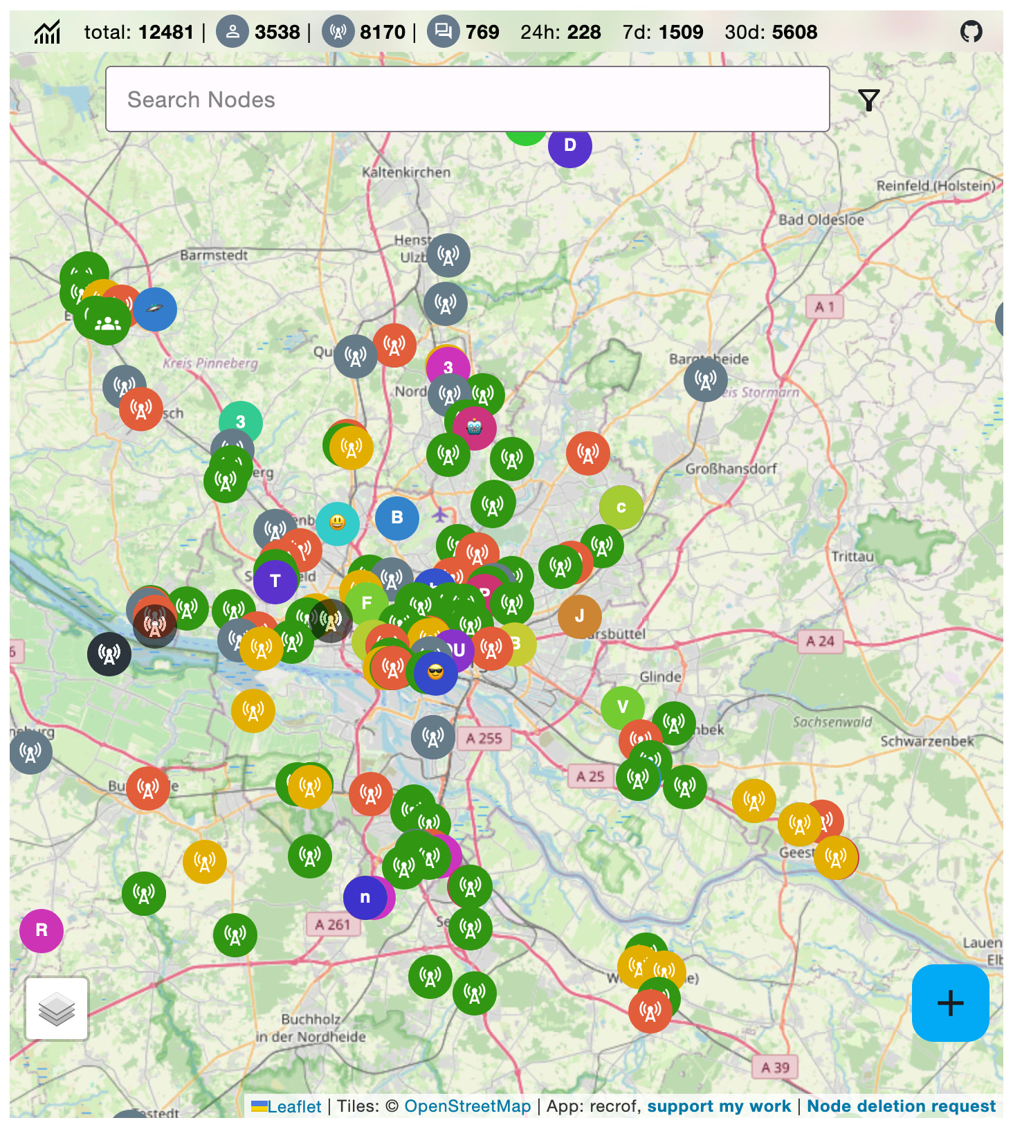 Das HanseMesh Netzwerk hat 1.000-12.000 Knoten im Raum Hamburg, mit ein paar guten Standorten der Repeater, wie die Karte zeigt. ![]()